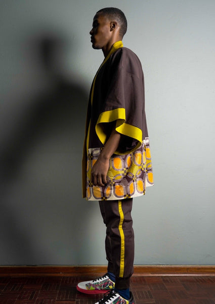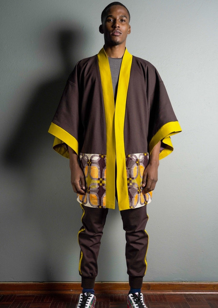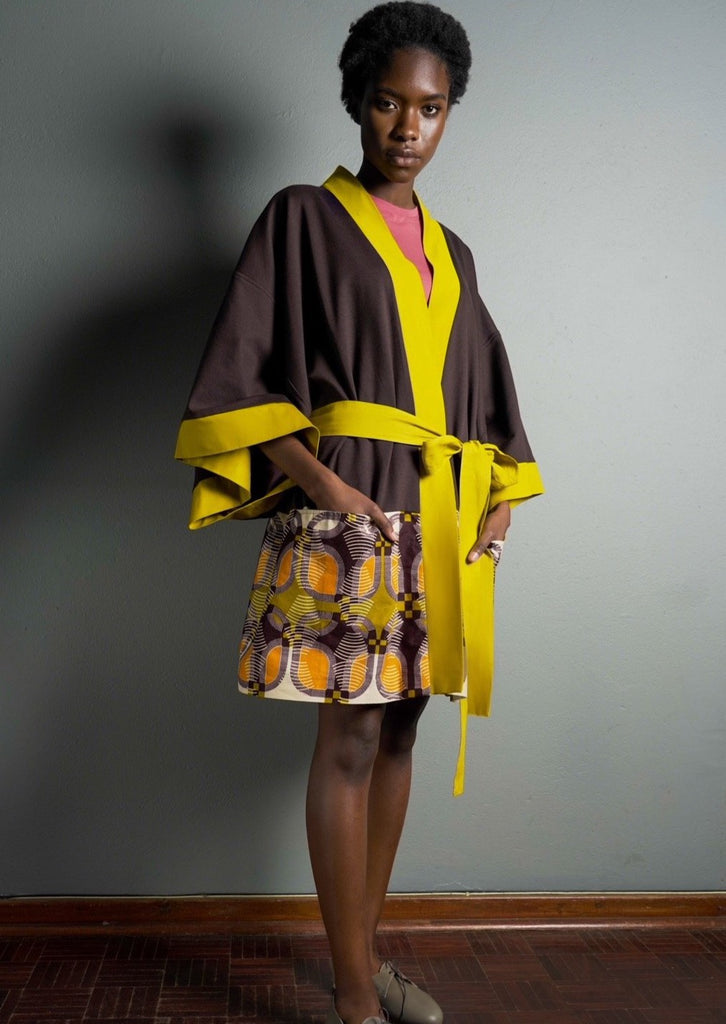 Knit kimono with cotton print panels, this versatile piece can we worn as a overskirt or belted up as a dress. Relaxed fit, not gender specific.